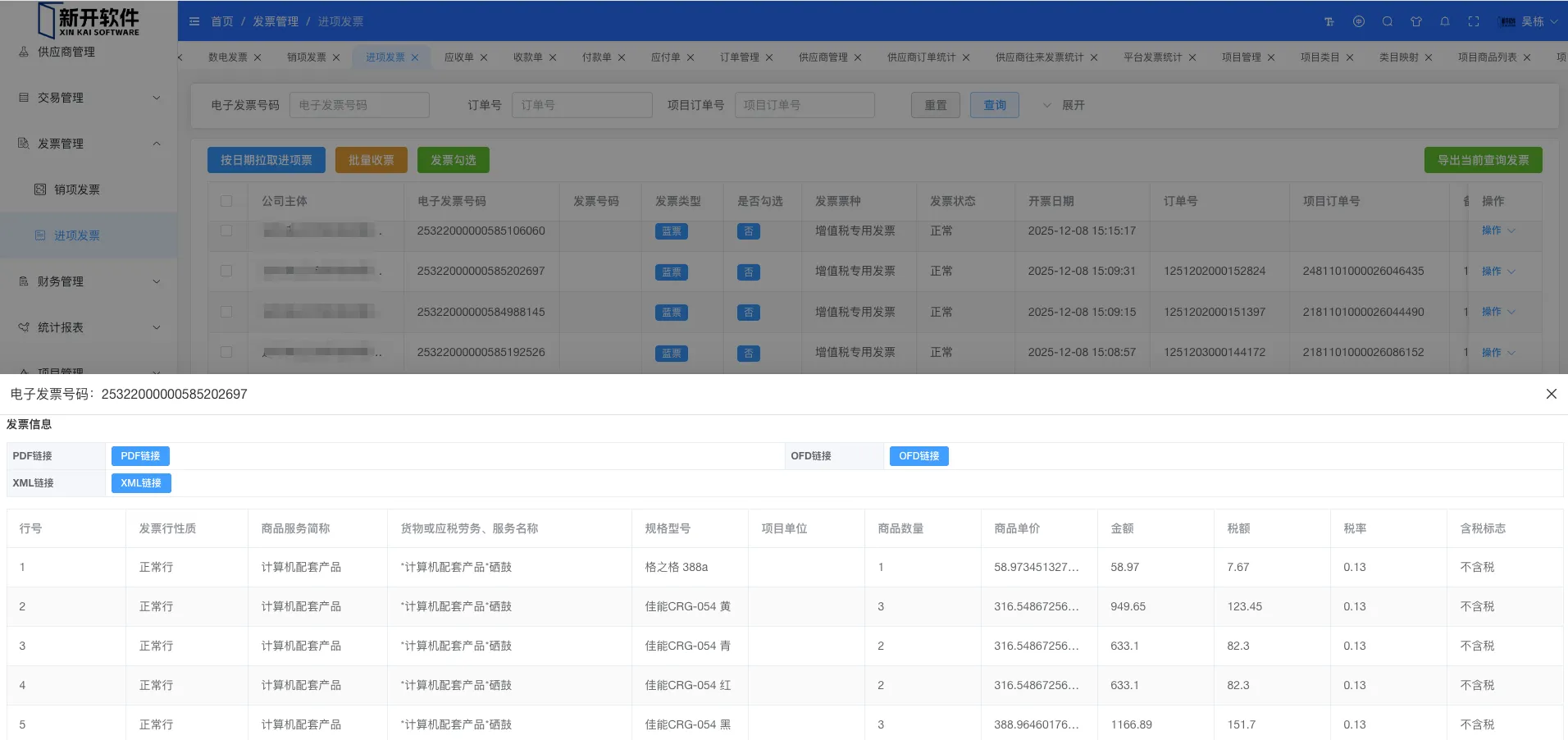 展示所有进项发票信息。