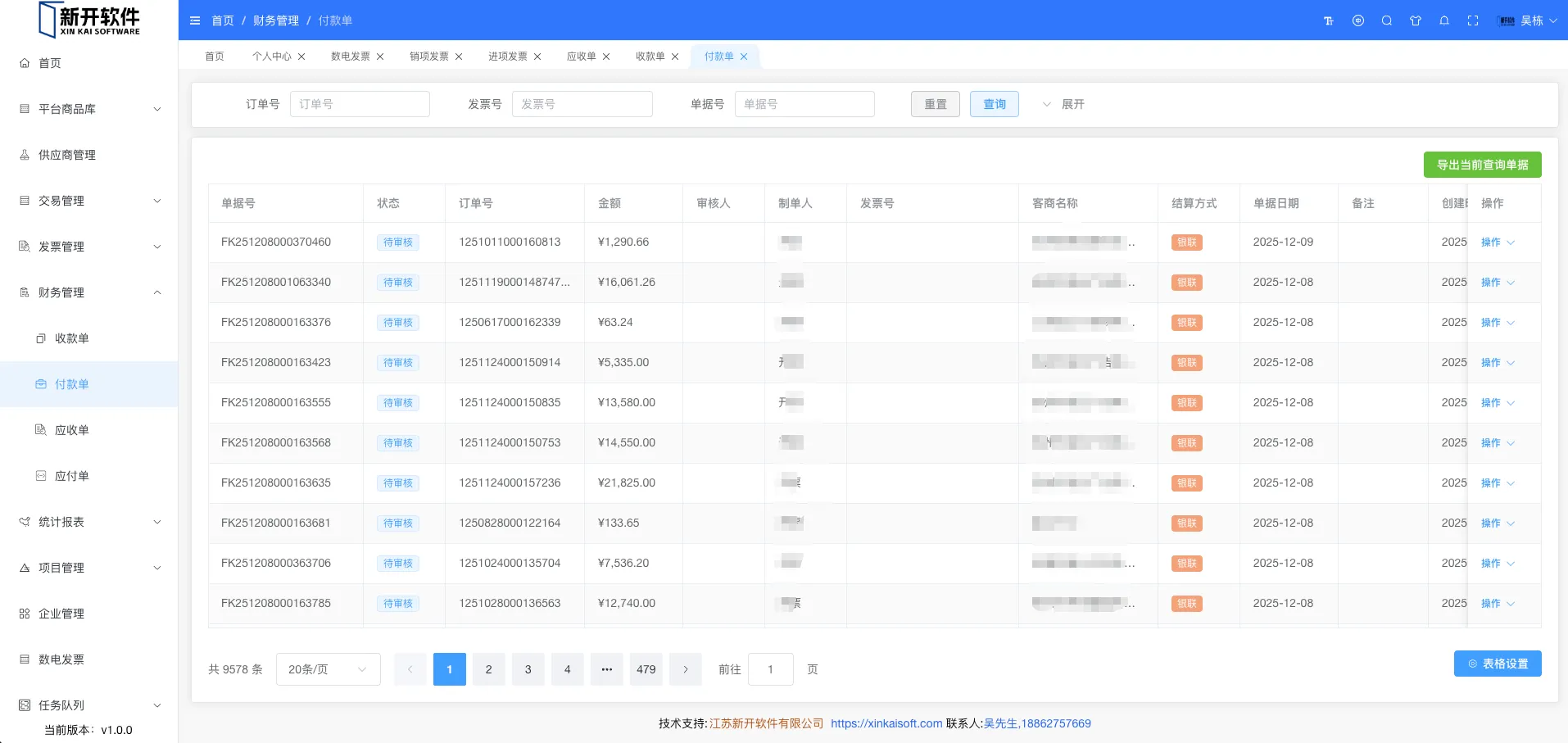 展示所有付款单信息。