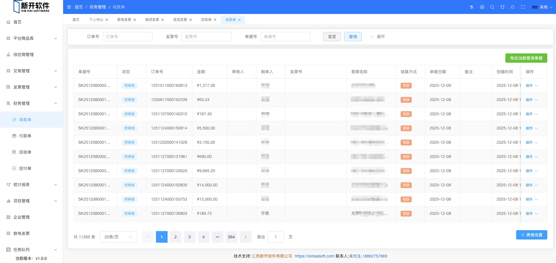 展示所有收款单信息。