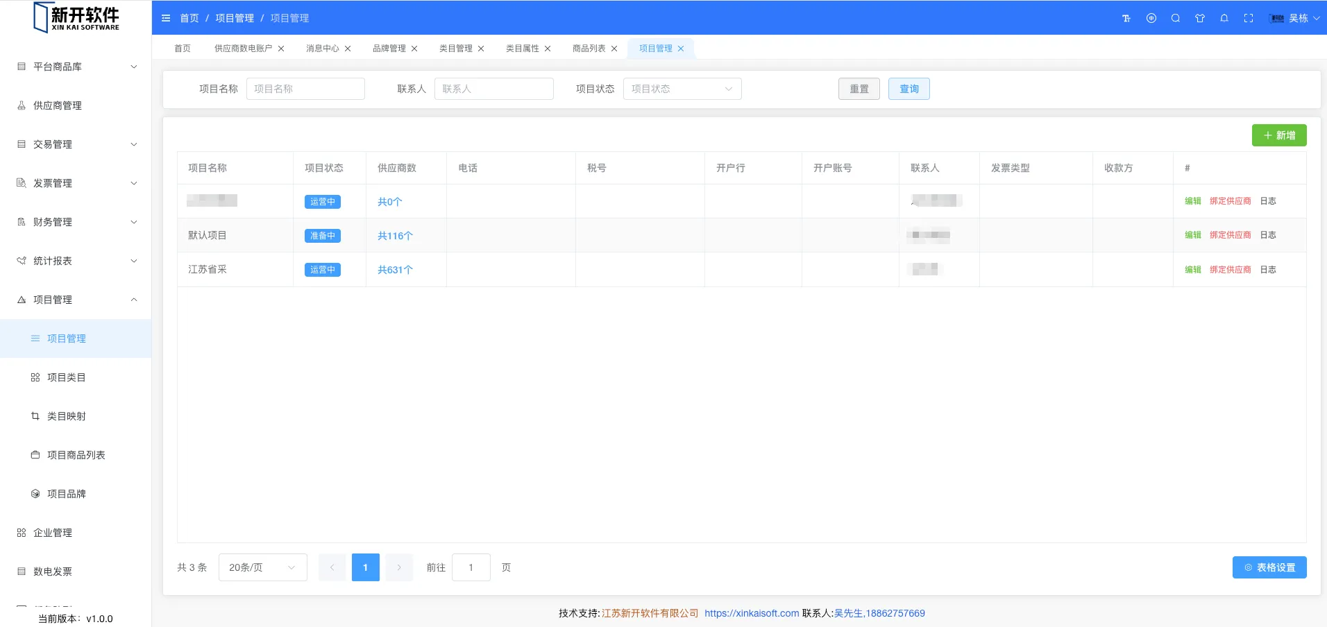 供应商数:展示当前项目下单供应商信息,同时可修改制定服务商的服务税率。